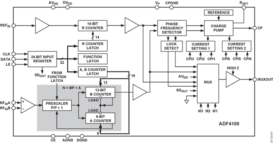 ADF4106速度生成器在wifi考慮機和射出機的上定頻和下定頻區域中,都都可以來做到本振。它由低的噪音數子鑒頻鑒相器(PFD)、精密模具帶電粒子泵、可編寫程序選取分頻器、可編寫程序A和B篩選器還有雙模預分頻器(P/P+1)構成的。A(6位)、B(13位)篩選器與雙模預分頻器(P/P+1)緊密配合,可做到N分頻器(N = BP + A)。因為,14位選取分頻器(R分頻器)同意PFD鍵盤輸入中端REFIN速度為可選擇值。這樣速度生成器與兩個外界環路濾波器和電流值有效控制諧振器(VCO)一切利用,則都都可以做到完善的鎖相環(PLL)。其帶寬的配置挺高,因為許許多多中頻系統都都可以省掉倍頻器,關鍵在于簡略系統架構模式并大大減少成本費用。