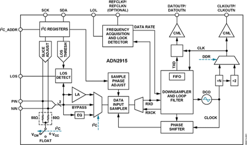 當輸入(ru)信號電(dian)平降至用戶可(ke)編程閾值以下時,接(jie)收器(qi)前端信號丟(diu)失(shi)(LOS)檢(jian)測(ce)電(dian)路(lu)會予以提示。LOS檢(jian)測(ce)電(dian)路(lu)具有(you)遲滯特(te)性,可(ke)防(fang)止(zhi)LOS輸出震顫(zhan)。此外,可(ke)通過I2C寄存(cun)器(qi)讀取輸入(ru)信號強度。