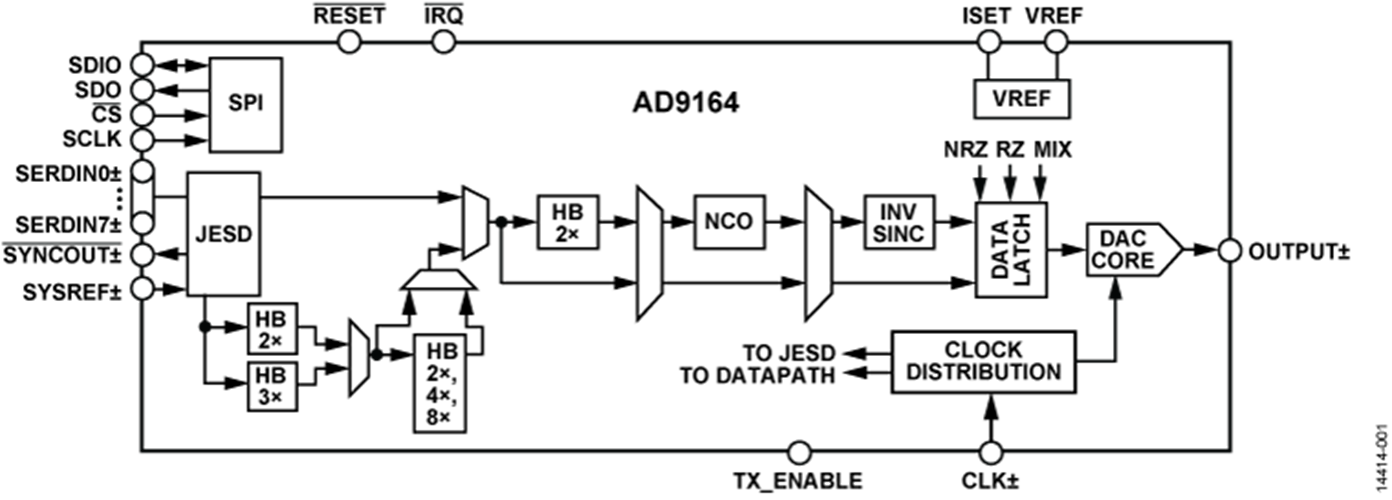 在基帶格局下,部件的寬模擬網資源帶寬起步業務能力和高新動態展示領域相融合,在面積最小一名載波至較大1.791 GHz衛星信號資源帶寬起步的滿示值頻譜領域內可適用DOCSIS 3.1拖鏈電纜基礎條件設施設備合法合法性。2倍插值濾波器(FIR85)使AD9164并能真對較低數據報告文件頻率和改變器石英鐘通過安裝,以消減機系統總體目標額定功率和濾波耍求。在Mix-Mode?運營格局中,AD9164可在達到7.5 GHz的二階和三階奈奎斯特居民區重新構建RF載波,時仍改變不錯的新動態展示領域。輸入輸出電壓電流會在8 mA至38.76 mA領域內通過代碼。AD9164數據報告文件接口方式由最常幾個JESD204B串行器/解串器(SERDES)通路根據,可對其通路快慢和通路數通過代碼,于是改變利用利索性。