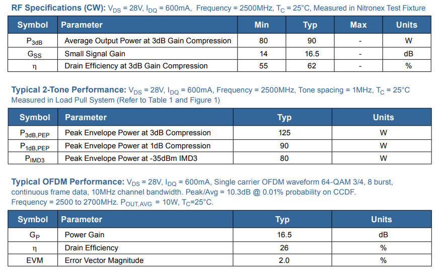 電源電壓:28伏 PSAT:90 W 增益:16分貝 測試頻率:2.5千兆赫 θJ-C:1.8 C/W