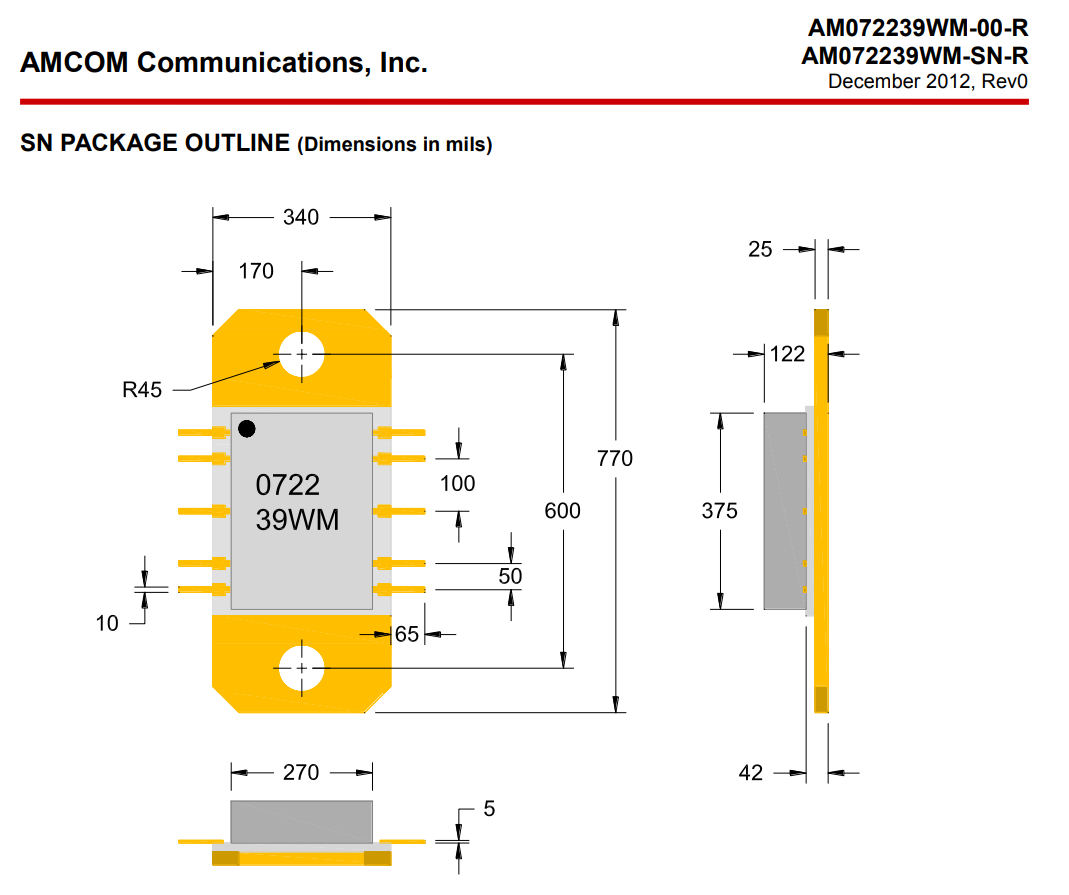 AMCOM的(de)(de)AM072239WM-SN-R是(shi)寬帶(dai)網GaAs MMIC功效(xiao)拖動器(qi)。它很多個30dB小預警收(shou)獲和(he)39 dBm(8W)達到飽和(he)狀態輸入輸出的(de)(de)額定的(de)(de)CW的(de)(de)性能工作電(dian)(dian)壓(ya)超0.7至(zhi)2.2GHz頻段(duan)。MMIC在兩人電(dian)(dian)子(zi)器(qi)件(-00—R)中供給。包(bao)(-SN-R)數據表。AM072249WM SN-R是(shi)陶瓷(ci)制品(pin)二極管封(feng)裝(zhuang)中的(de)(de)一些(xie)。蝶閥法蘭和(he)直RF和(he)DC引致轉(zhuan)配的(de)(de)降低。仍然直流電(dian)(dian)源(yuan)熱效(xiao)率高耗(hao)散,不錯的(de)(de)導熱是(shi)須要(yao)的(de)(de),電(dian)(dian)源(yuan)芯片MMIC一定要(yao)安轉(zhuan)運行(xing)可以(yi)在廢金屬脊(ji)進取心(xin)行(xing)共(gong)晶(jing)釬焊。集成塊和(he)二極管封(feng)裝(zhuang)全是(shi)ROHS逆(ni)來順受的(de)(de)