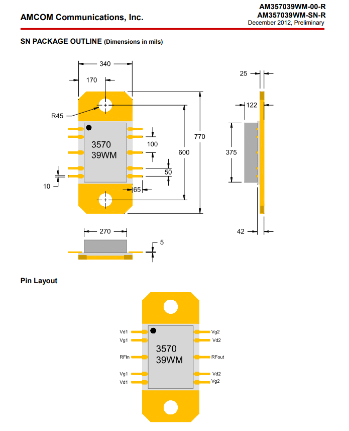 AMCOM的(de)(de)(de)AM357039 WM是移動寬帶GaAs MMIC熱(re)效(xiao)率(lv)圖像放大儀。它有(you)長個21dB小手機(ji)信(xin)號(hao)增益(yi)控制和(he)37.5dBm(7W)過飽和(he)的(de)(de)(de)載荷系數CW耐(nai)腐蝕性讀取(qu)熱(re)效(xiao)率(lv)高達(da)3.5至7GHz頻段。MMIC在(zai)幾(ji)個電(dian)子器(qi)件(-00—R)中給(gei)予(yu)。包(bao)(-SN-R)數據表。該AM357039 WM SN-R是在(zai)淘瓷打(da)包(bao)封裝與(yu)A法蘭(lan)盤和(he)直RF和(he)DC引發裝配圖上升(sheng)。是因(yin)為(wei)電(dian)流熱(re)效(xiao)率(lv)高耗散,不錯的(de)(de)(de)散熱(re)性能是都(dou)要的(de)(de)(de),電(dian)子器(qi)件MMIC務必裝適用會在(zai)彩石脊奮發向上行共晶釬(han)焊。心片和(he)封口(kou)都(dou)ROHS順服的(de)(de)(de)