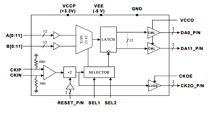 12位2:1(總共24:11)多路復用器,每個差分輸出位工作超過4 Gbps。