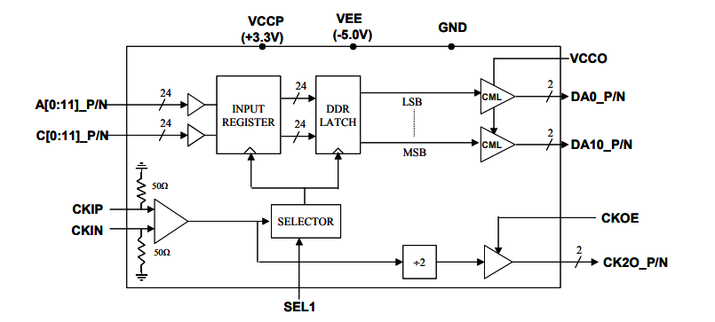 MX2412H相當于2:1多路復用器的高速12通道。雙數據速率鎖存器使12位差分數據輸出的數據速率為時鐘速率的兩倍。輸出驅動器的上拉電源VCCO可用于設置適合于最流行的高速接口標準,如CML或LVDS的輸出電平。多路復用器可以是